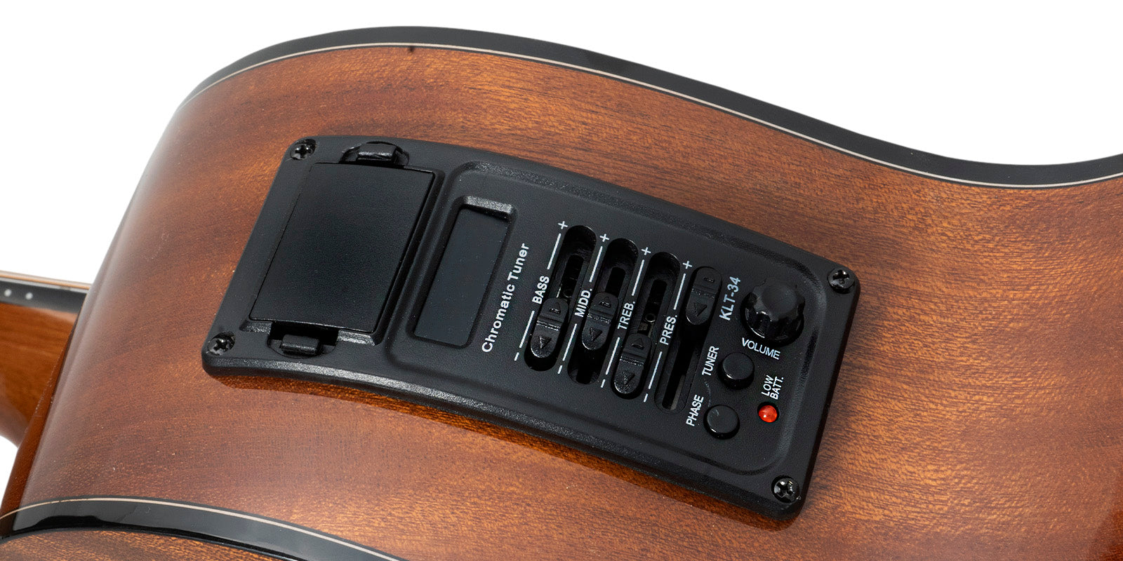 Guitarra Electroacústica Docerola de un sonido robusto y alta resonancia debido a su estructura tradicional tejana. Fondo de caoba y marcos de maple. Incluye un afinador digital KLT-34 de 4 bandas. Una guitarra especializada para aquellos músicos que buscan una opción accesible y de muy buena calidad.